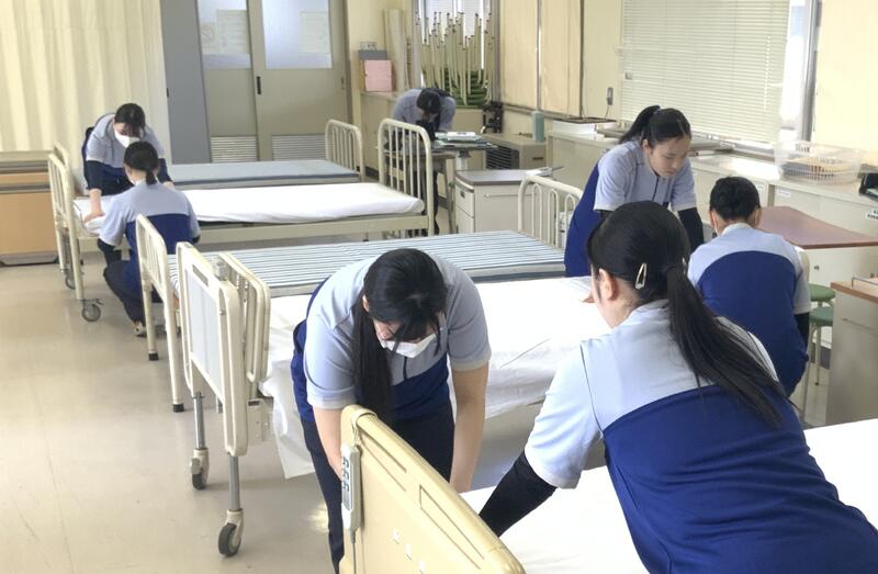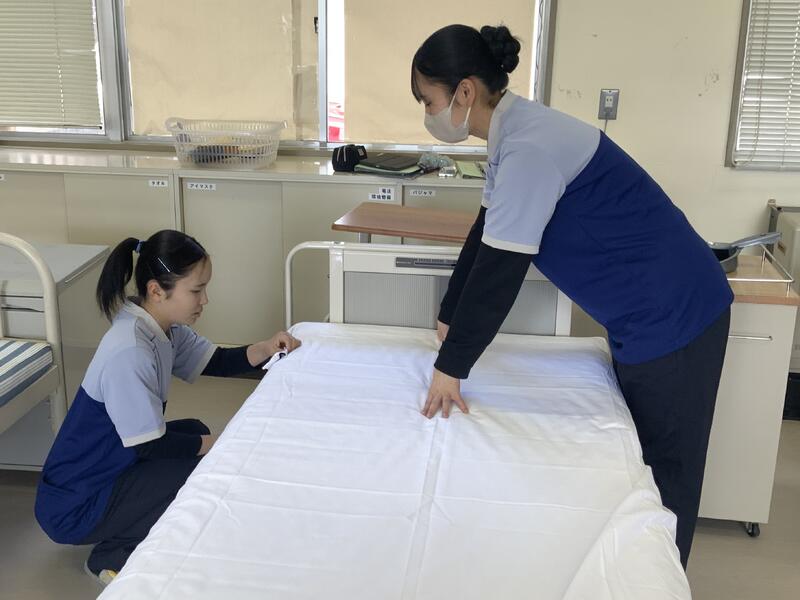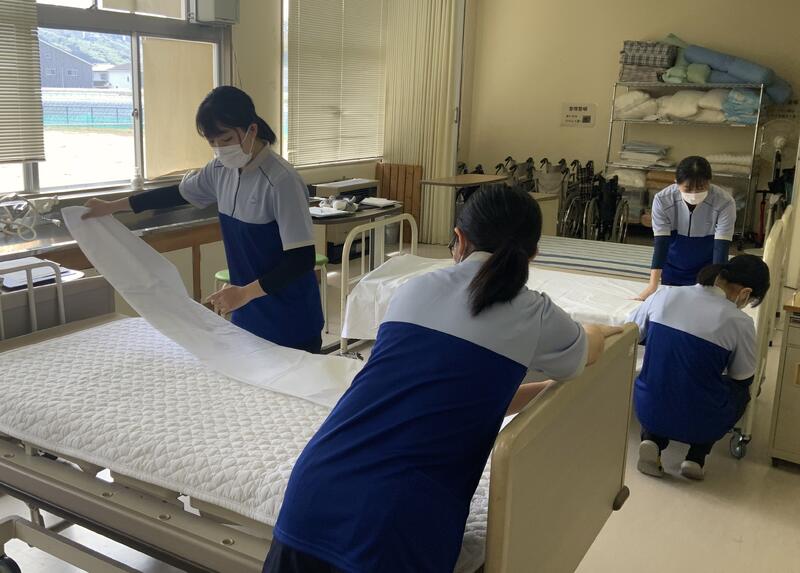4月22日、福祉系列の3年次生が「生活支援技術」の授業で、ベッドメイキングの技術を改めて磨き直しました。